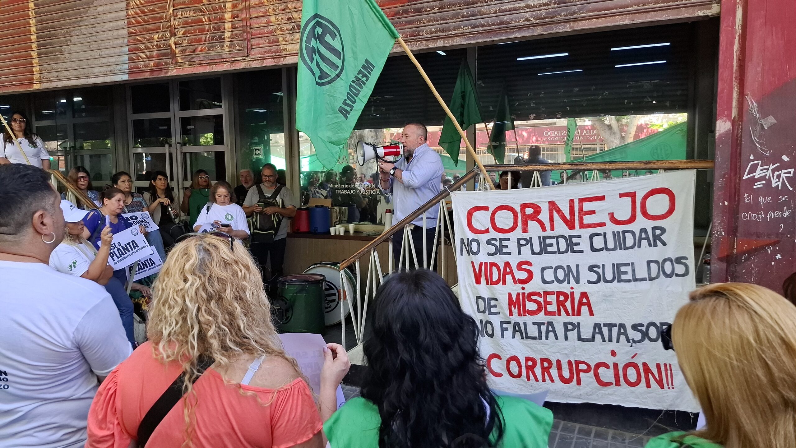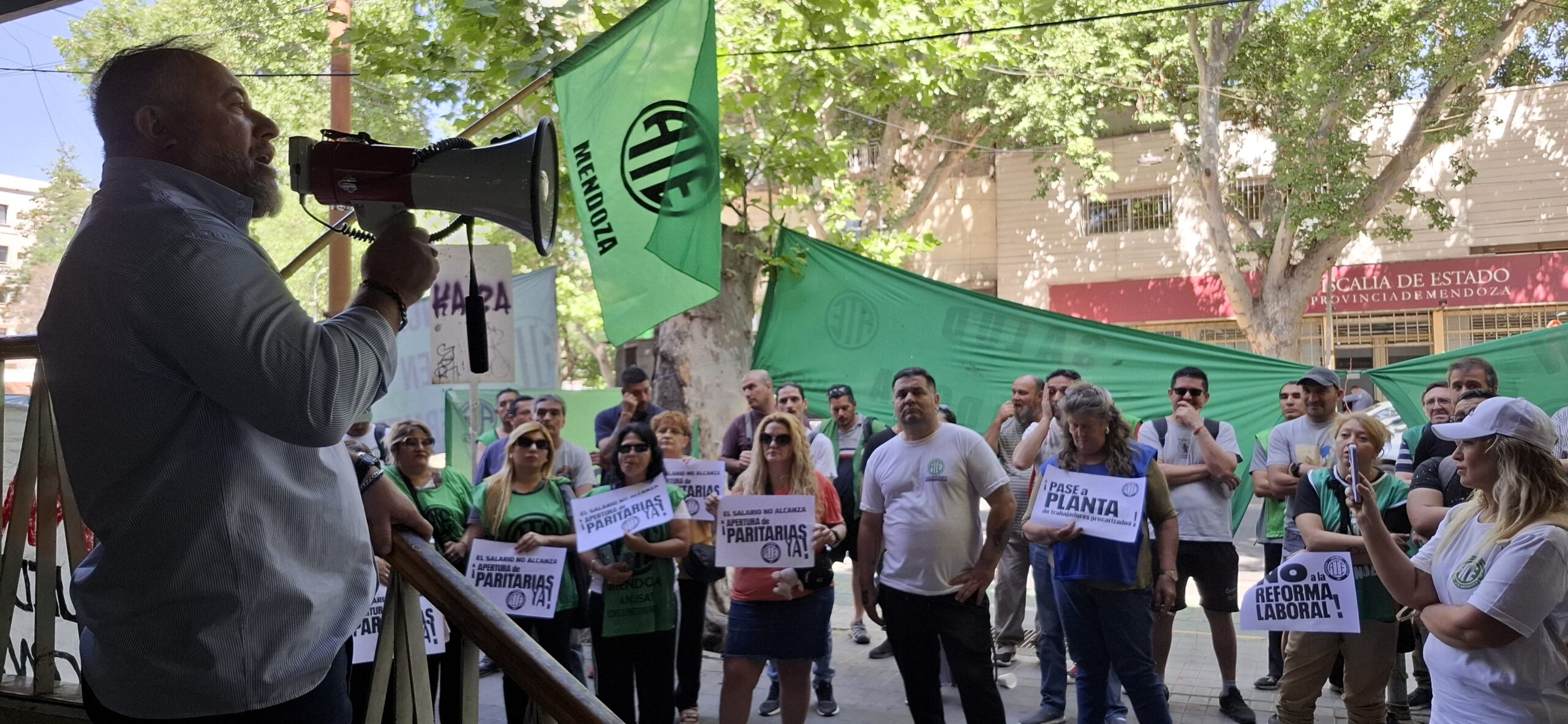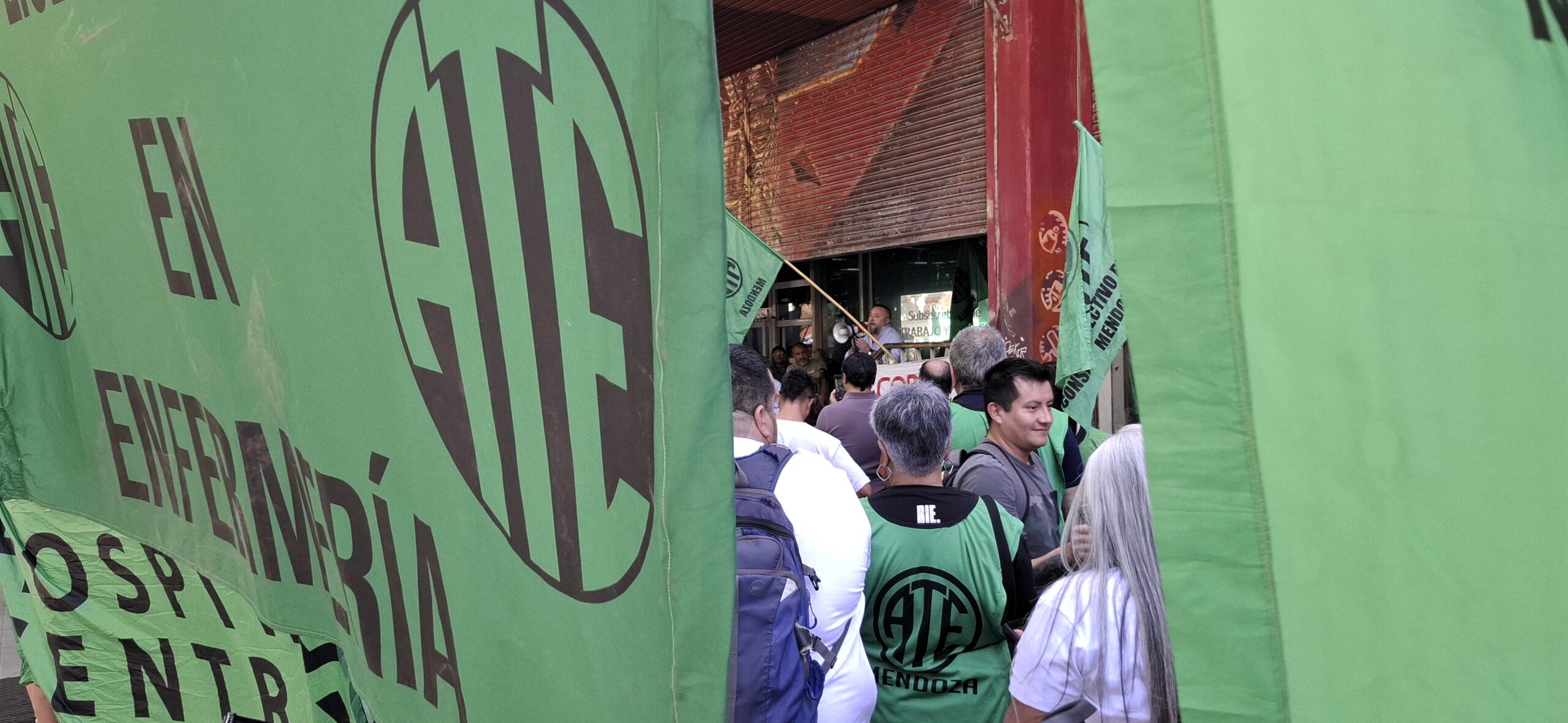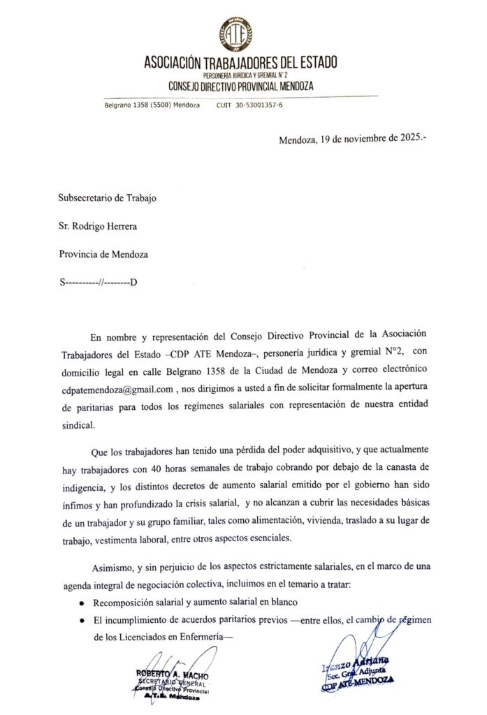 “Venimos a pedir la apertura de paritarias, ya que los últimos aumentos salariales que tuvimos fueron otorgados por decretos de hambre, con trabajadores cobrando $700.000, cumpliendo 40 horas semanales de trabajo”, fustigó Roberto Macho, Secretario General de ATE Mendoza, tras culminar una nutrida asamblea en la explanada de la Subsecretaría de Trabajo, y considerar que “según entendemos con esto, el Gobierno está implementando una política de hambre en la provincia de Mendoza, para que los trabajadores estatales renuncien, dejen de trabajar, y así poder privatizar las distintas áreas laborales del Estado, como ya están haciendo en los servicios de Salud: camilleros, cocina, mucamos, seguridad, entre otros”.