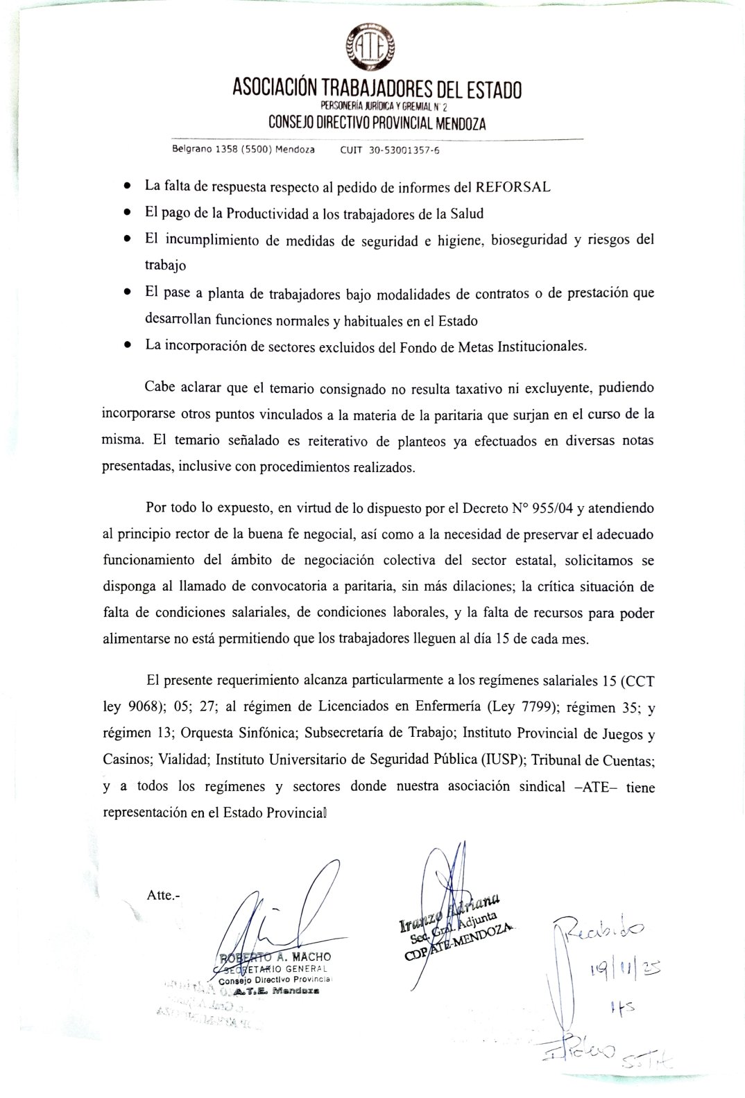 El pedido de apertura de paritarias alcanza a todos los sectores que representamos de manera mayoritaria: Salud, Desarrollo Social, Administración Central, entes autárquicos, centralizados y descentralizados. Además, también estamos solicitando que el Poder Ejecutivo dé cumplimiento a los acuerdos paritarios que ya tenemos, donde se contempla el cambio de régimen de los Licenciados en Enfermería; el pago de retroactivos; y pases a planta de los más de 2.300 compañeros y compañeras que siguen trabajando de manera precarizada, como contratados y prestadores.
