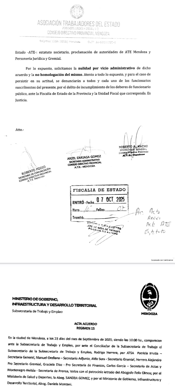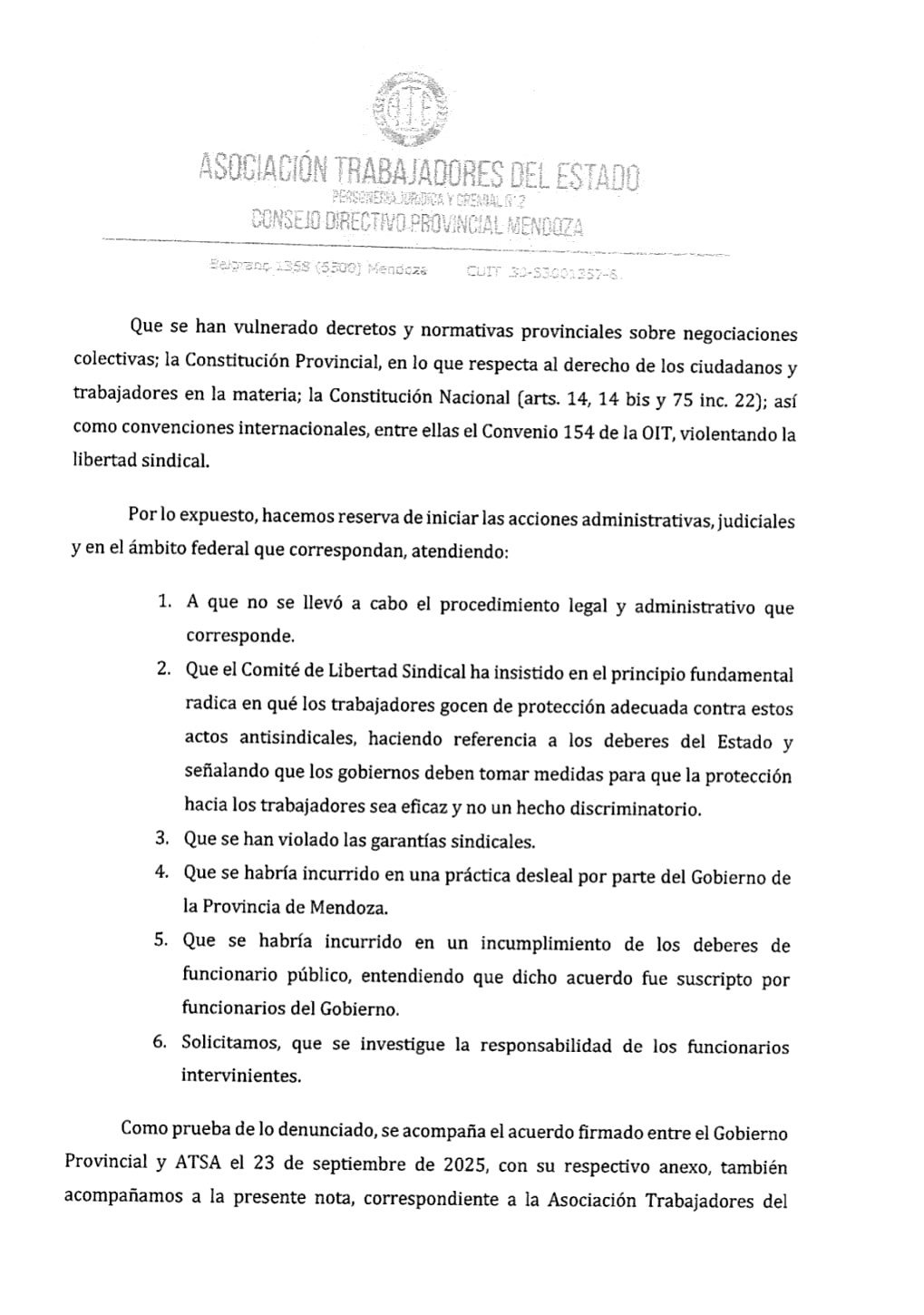 ATE Mendoza, como sindicato mayoritario, realizó las denuncias públicamente, a través de la Subsecretaría de Trabajo y las cámaras laborales, sobre los reiterados incumplimientos del Gobierno en cuanto a: pases a planta de trabajadores precarizados; cambio de régimen y reconocimiento de Licenciados en Enfermería; pago de la productividad; y las medidas de Seguridad, Higiene y Bioseguridad.