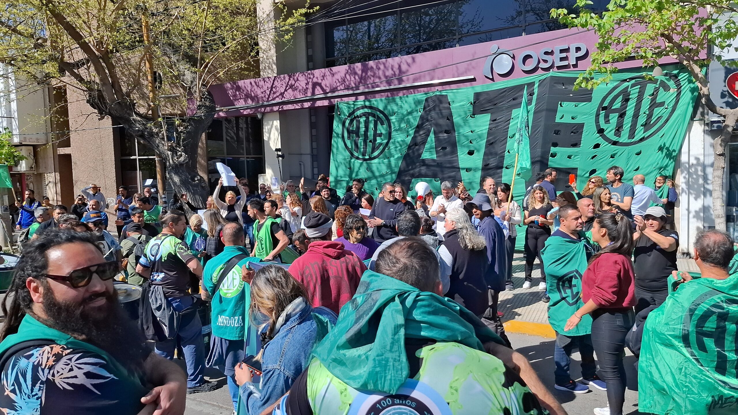 Luego de mantener una multitudinaria concentración en el Nudo Vial, donde repartimos panfletos, mientras la población expresaba su adhesión a los reclamos, marchamos de manera pacífica, con bombos, pancartas y banderas verdes de lucha, cortando media calzada, hasta llegar a la sede central de OSEP, donde realizamos un significativo acto de protesta colectiva.
